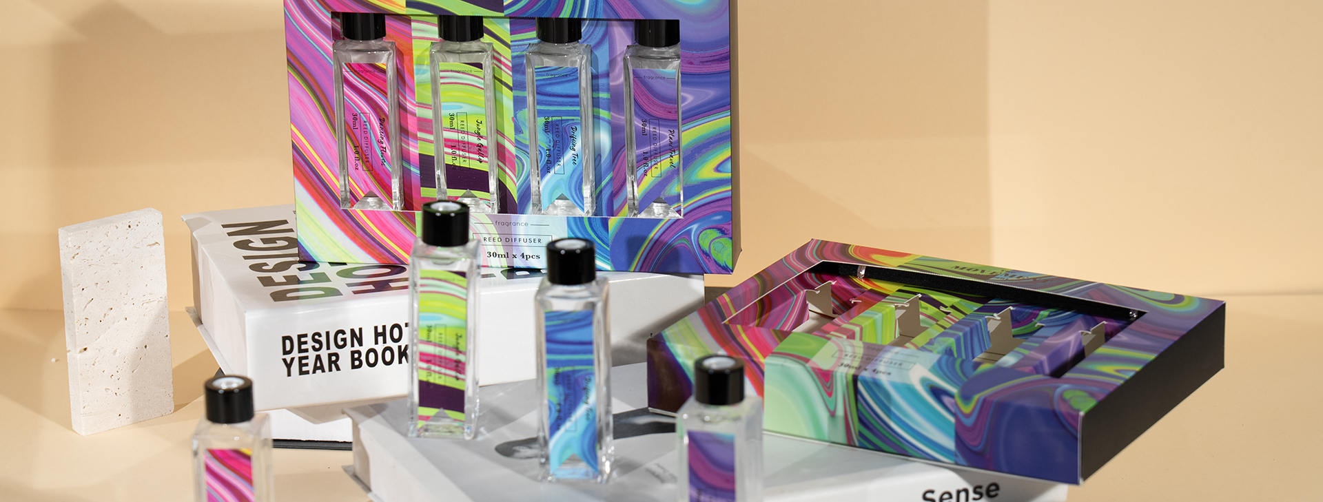 Tilpasset hjemmeduft med ditt valg av størrelse, farge, innpakning og duft – blomster, fruktig, sandeltre, rav og mer.